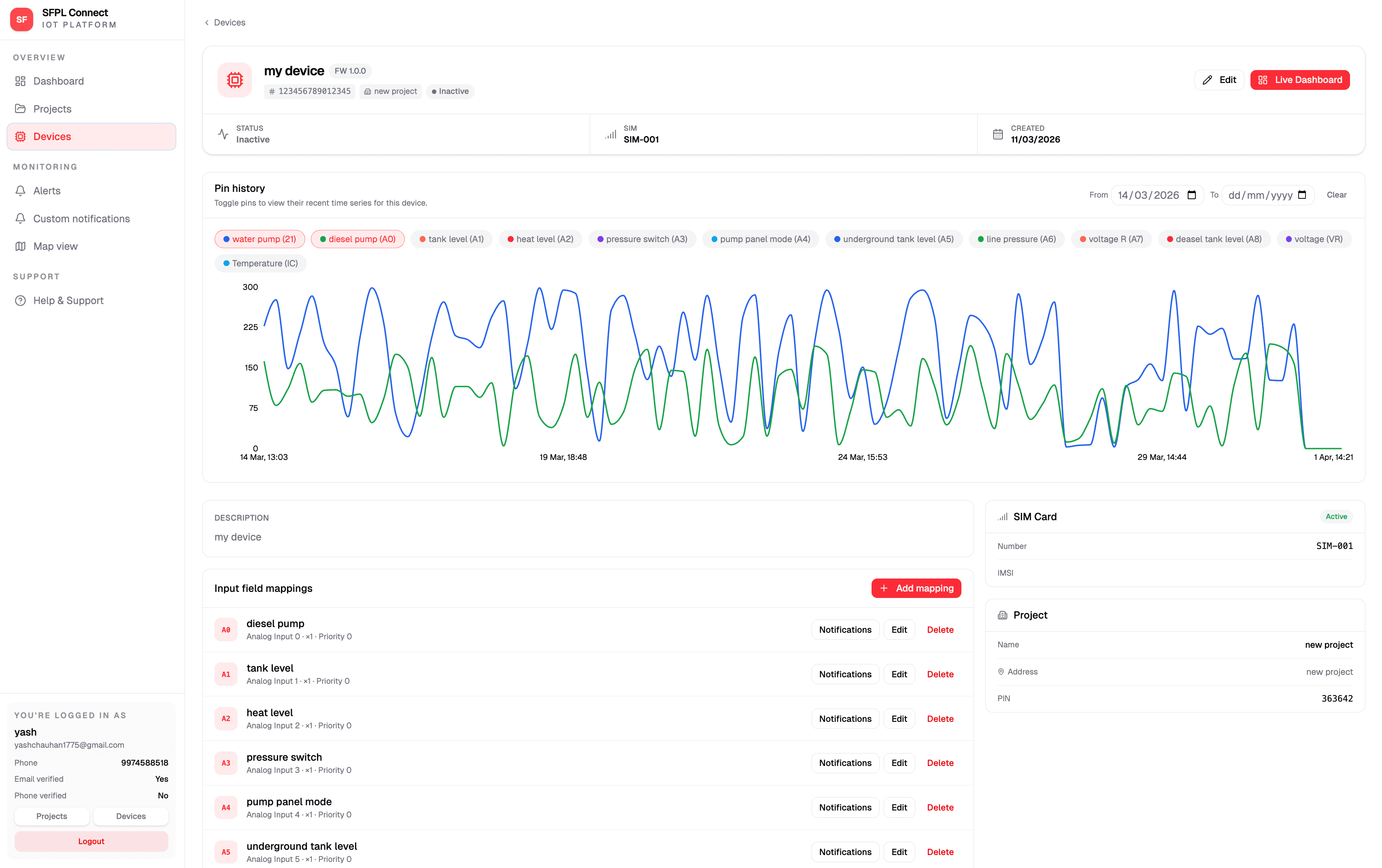Real-time dashboards for each device with live data visualization.